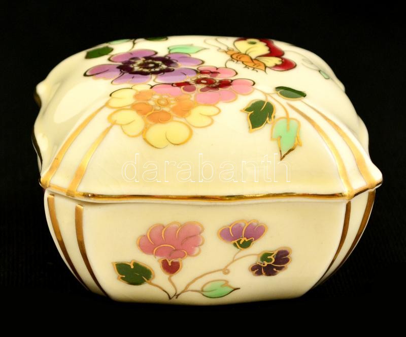 Leírás: Zsolnay ékszertartó dobozka, kézzel festett, jelzett, apró kopásokkal, 7,5×7,5×4 cm