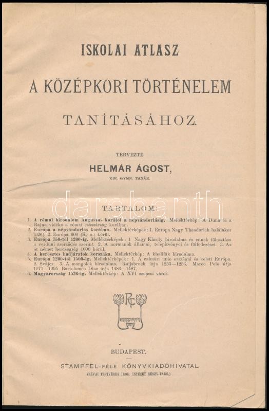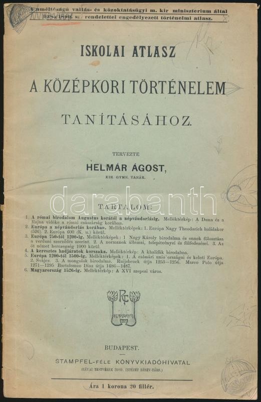 cca 1890 Helmár Ágost: Iskolai atlasz a középkori történelem tanításához. Bp., Stampfel-féle Könyvkiadóvállalat (Révai),(Pozsony, Eder István-ny.), 2 p.+ 6 t. Kiadói papírkötés, a borítón firkával.
