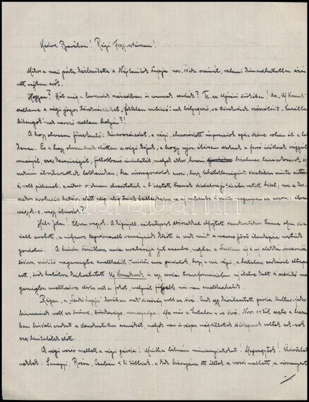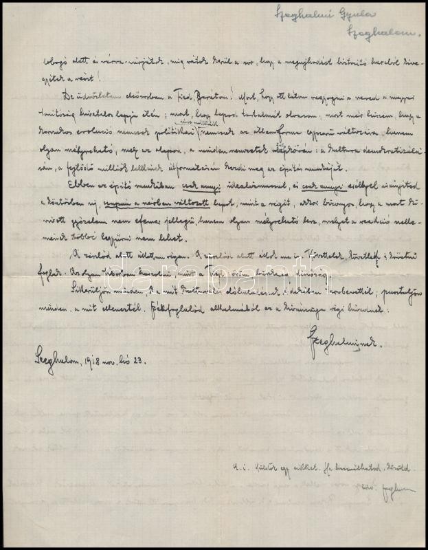 Leírás: 1918 Szeghalmi Gyula (1876-1963) író, helytörténész, régész, fényképész saját kézzel írt levele, hajtásnyomokkal.