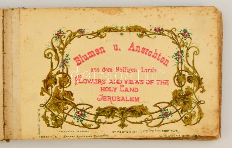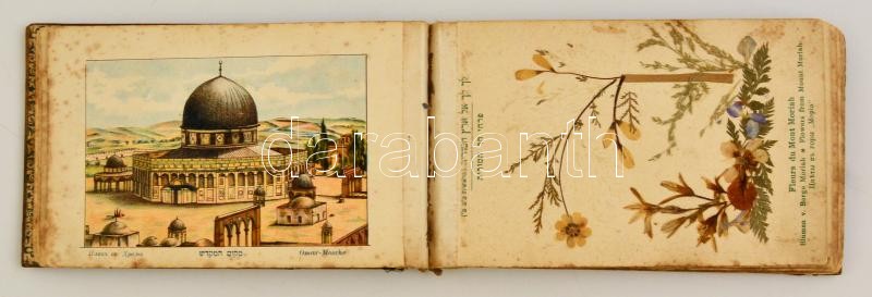 cca 1900 A Szentföld virágai fa-borítású füzet 12 képpel és szárított virágokkal. Egy két virág sérült / Flowers and views of the Holy Land. 12 dried flowers in wood covered booklet. Some damaged
