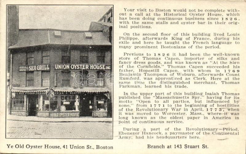 Boston, Massachusetts; Union Street, Old Oyster House, advertisment https://www.darabanth.com/hu/326-Gyorsarveres/326.0/Kepeslapok/Amerikai-Egyesult-Allamok~2500013/Boston-Massachusetts-Union-Street-Old-Oyster-House-advertisment~II1198222