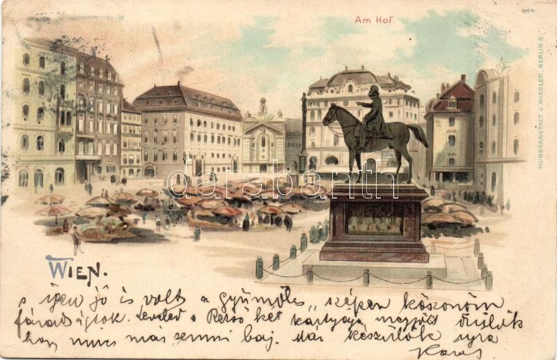 1900 Vienna, Wien; Am Hof / market square with monument. Kunstanstalt ... https://www.darabanth.com/hu/326-Gyorsarveres/326.0/Kepeslapok/Ausztria~2500015/1900-Vienna-Wien-Am-Hof-market-square-with-monument-Kunstanstalt-J-Miesler-litho-EK~II1777338