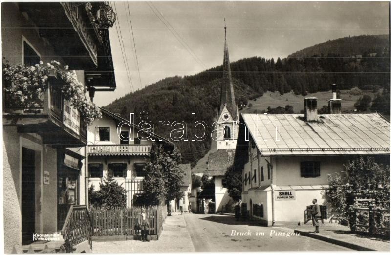Bruck im Pinzgau (Bruck an der Grossglocknerstrasse); Strassenbild, Kirche, Eisenwarenhandlung, Adolf Linhart Spängler-Glasermeister, Schell Pumpe im Ort, Gasthaus / street view with shops and church, guest house, gas station advertisement