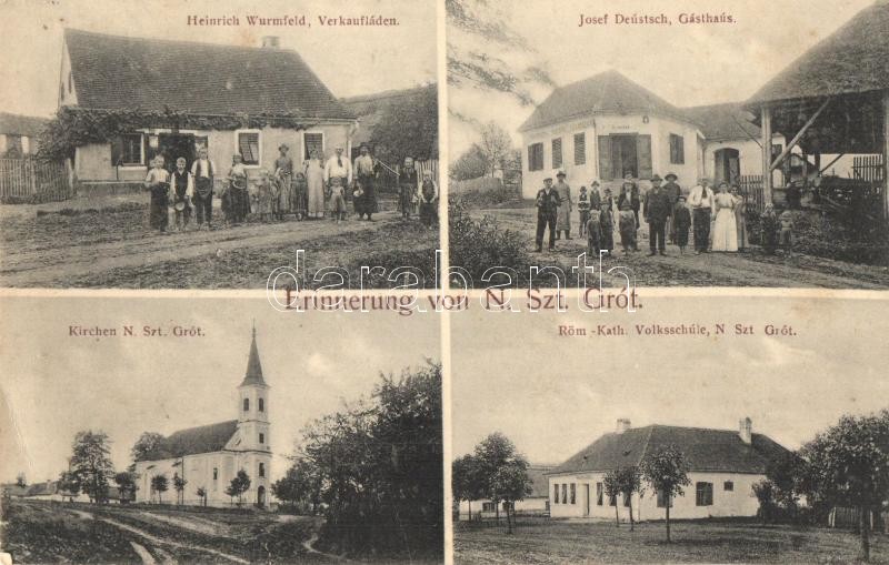 Leírás: 1912 Németszentgrót, Gerersdorf bei Güssing (Sóskútfalu); Római katolikus iskola, templom, Heinrich Wurmfeld üzlete, Josef Deutsch vendéglője / Verkaufladen, Gasthaus, Kirche, Volksschule / school, church, restaurant, shop (Rb)