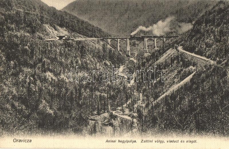 1911 Oravica-Anina, Oravita-Anina; Vasúti hegyipálya, Zsittini-völgy viadukt és alagút gőzmozdonnyal. Weisz Felix kiadása / mountain railway bridge and tunnel, viaduct