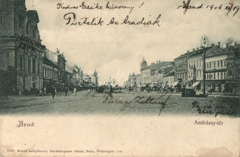Leírás: Arad, Andrássy tér, üzletek. Nachbargauer János kiadása (kis szakadás / small tear)