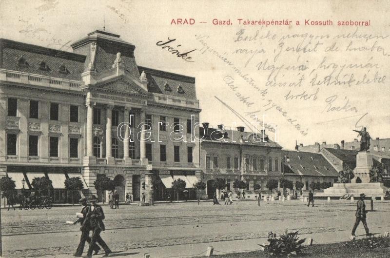 Leírás: Arad, tér, Gazdasági takarékpénztár, Kossuth szobor, Braun M. ruha raktára / square, bank, statue, shops