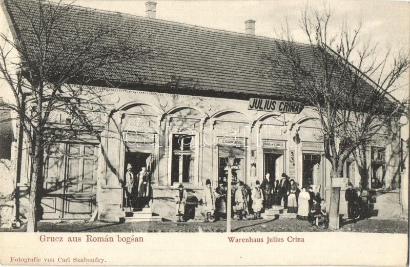 Leírás: Boksánbánya, Románbogsán, Bocsa; Julius Crina üzlete. Carl Szabonáry felvétele / Warenhaus / shop