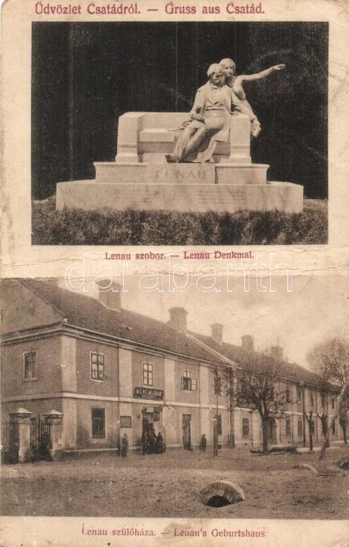 Csatád, Cetad, Lenauheim; Lenau szobor, Lenau szülőháza, Wilhelm Jakab üzlete. Photogr. v. Mr. Julius Bierbaum / Lenau Denkmal, Lenau's Geburtshaus / Lenau statue, birthplace of Nikolaus Lenau (fa)