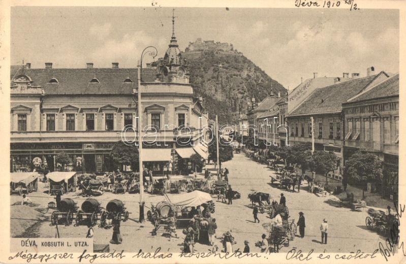 Déva, Deva; Kossuth Lajos utca, Fehér Kereszt szálloda, Hirsch Testvérek üzlete, piaci árusok. Kroll Gyula kiadása / street view, hotel, shops, market vendors (EK)