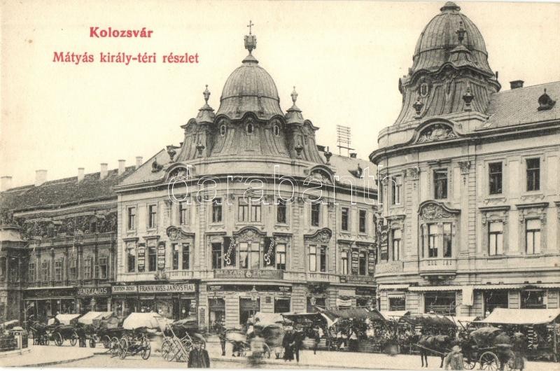 Kolozsvár, Cluj; Mátyás király tér, Frank-Kiss János fiai, Deutsch József, Jeney Lajos üzlete, Magyar Francia Biztosító Rt., Trieszti Általános Biztosító Rt.. Lepage Lajos kiadása / square, shops, insurance company (enyhén ázott sarok / slightly wet corner)