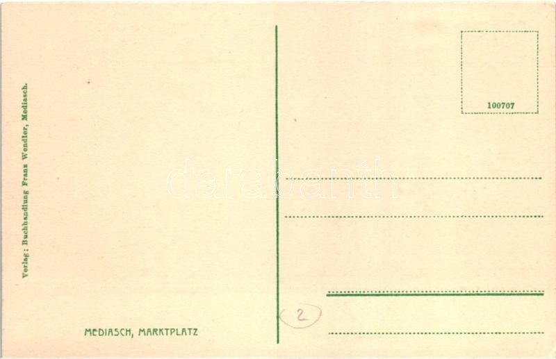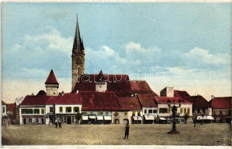 Leírás: Medgyes, Mediasch, Medias; Marktplatz / Piac tér, üzletek, Franz Wendler kiadása / market square, shops (EK)