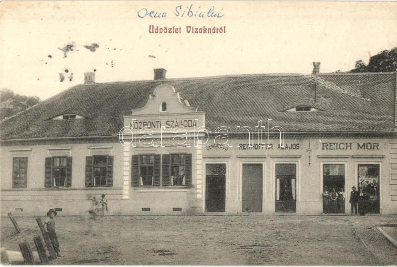 Leírás: Vízakna, Salzburg, Ocna Sibiului; Központi szálloda, vendéglő, étterem, Reithoffer Alajos, Reich Mór üzlete / hotel, restaurant, shops