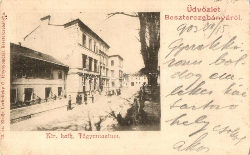 Leírás: Besztercebánya, Banská Bystrica; Kir. katolikus gimnázium. Kiadja Lechnitzky O. fénynyomdája 10. sz. / Catholic grammar school, gymnasium (Rb)