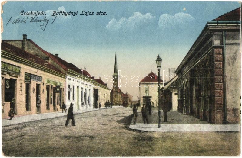 Leírás: Érsekújvár, Nové Zamky; Batthyányi Lajos utca, Singer varrógép és Kosztelecz Ede üzlete / street view with shops