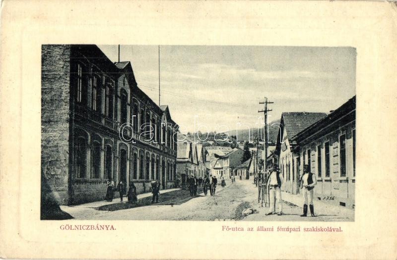 Gölnicbánya, Gelnica, Bergstadt Gölnitz; Fő utca, Állami fémipari szak... https://www.darabanth.com/hu/326-Gyorsarveres/326.0/Kepeslapok/Felvidek~2500007/Golnicbanya-Gelnica-Bergstadt-Golnitz-Fo-utca-Allami-femipari-szakiskola-W-L-Bp-2708-~II1816263
