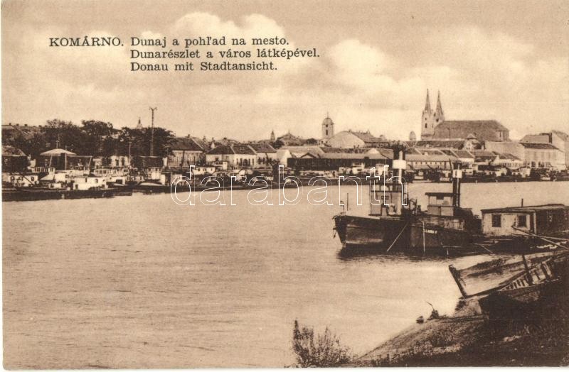 Leírás: Komárom, Komárno; Dunaj a pohl'ad na mesto / Duna részlet a város látképével, gőzhajók. L. H. K. No. 46. 1932. / Danube, steamships