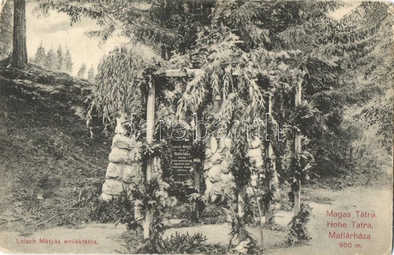 Leírás: Tátra, Matlárháza, Tatranské Matliare; Loisch Mátyás emléktábla. Kuszmann Gyula kiadása / monument (EK)