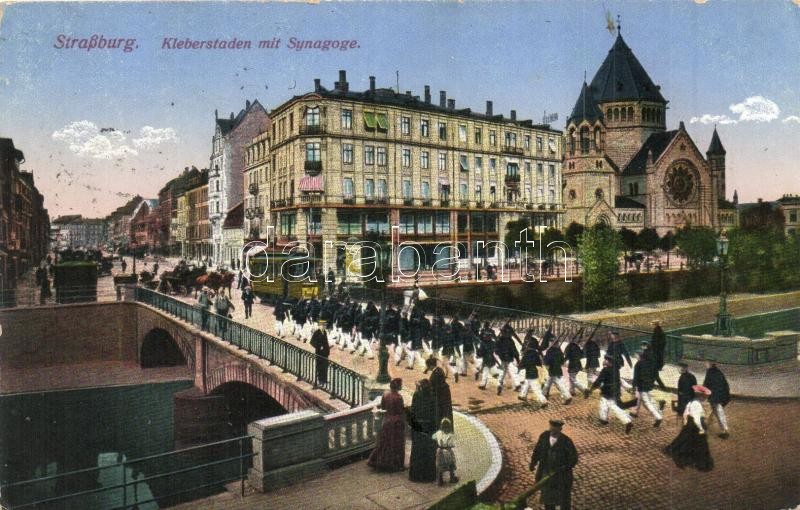 Leírás: Strasbourg, Strassburg; Kleberstaden mit Synagoge / street view with marching mariners, tram, synagogue. Judaica + 3. Fussartillerieregiment Ersatzbataillon Briefstempel