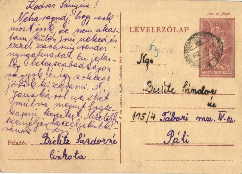 1942 Bielitz Sándor zsidó KMSZ-nek (közérdekű munkaszolgálatos) küldött levél a páhi munkatáborba 105/4 Tábori msz. IV. sz. / WWII Letter to a Jewish labor serviceman, Judaica + 12f Ga. (EK)