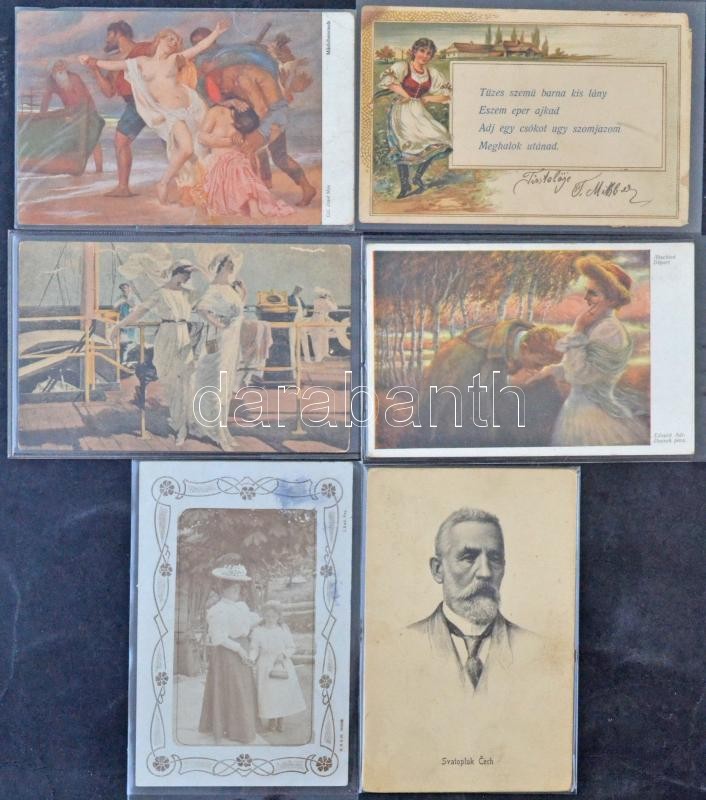 Szép művészeti képeslap gyűjtemény hagyatékból, több mint 500 db zömmel a 10-es 20-as évekből, közte kevés egyéb motívum és üdvözlőlap, dobozban. / About 500 mostly art, thematic, greeting postcards in a box