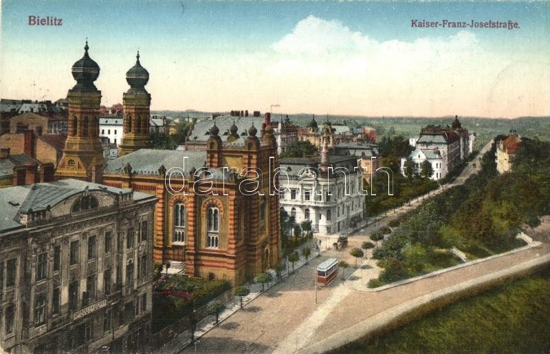 Leírás: Bielsko-Biala, Bielitz; Kaiser Franz Josefstrasse, Zahntechnisches Atelier / street view with synagogue, tram, dentistry (EK)