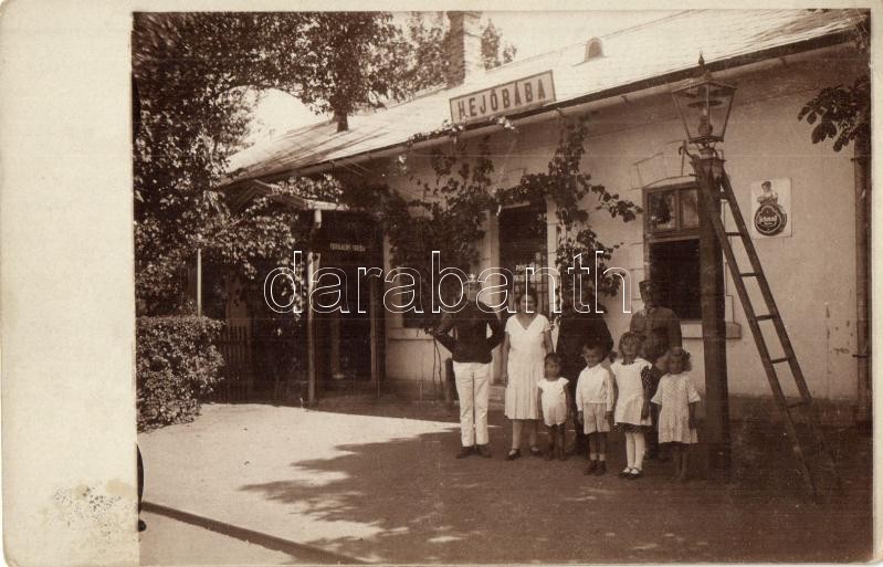 Leírás: ~1910 Hejőbába, vasútállomás, pénztár, váróterem és forgalmi iroda, Schmoll reklám poszter, létra és vasutasok csoportképe. photo (EK)