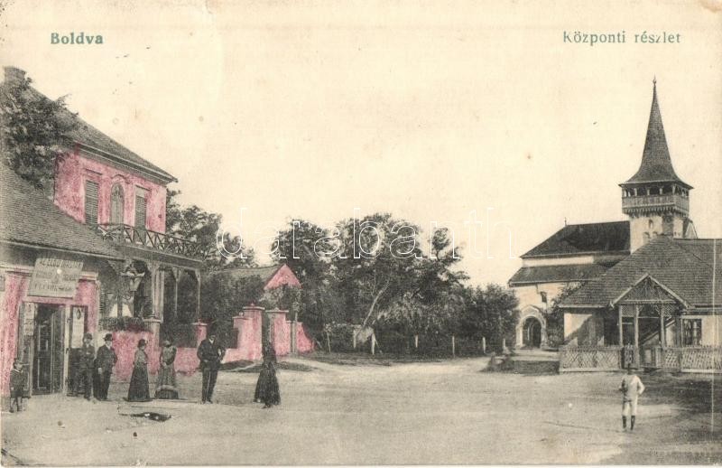 Leírás: Boldva, Központi részlet, Református templom, Első Magyar Biztosító Társaság ügynöksége. Dróth Gábor kiadása (EK)