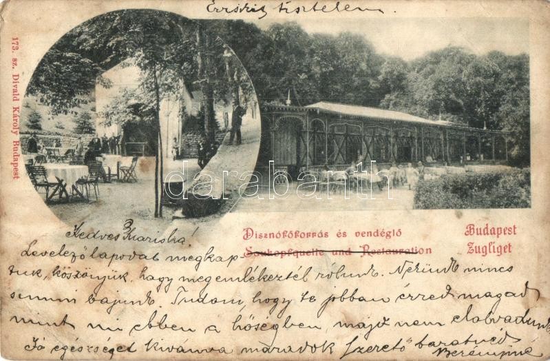 Leírás: Budapest XII. Zugliget, Disznófő forrás és vendéglő; Divald Károly 173. sz. (EB)