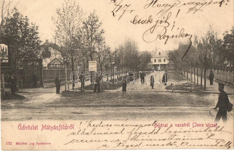 Leírás: Budapest XVI. Mátyásföld, Bejárat a vasútról (Imre utca), vendéglő, étterem, háttérben a Mátyás király szálloda (vágott / cut)