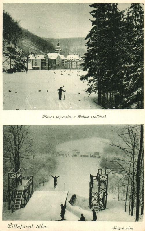 Leírás: Lillafüred, Havas táj, Palota szálloda télen, síugró sánc, síelők, téli sport