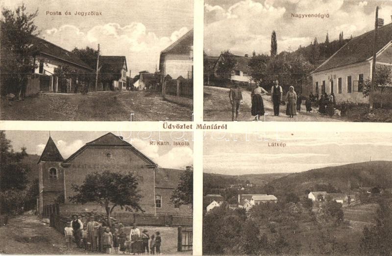 Leírás: Mánfa, Posta és jegyzőlak, Nagyvendéglő, étterem, Római katolikus iskola, látkép + 1918 Mánfa Postai Ügyn. pecsét