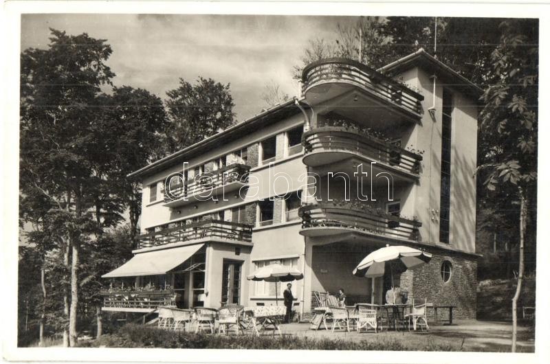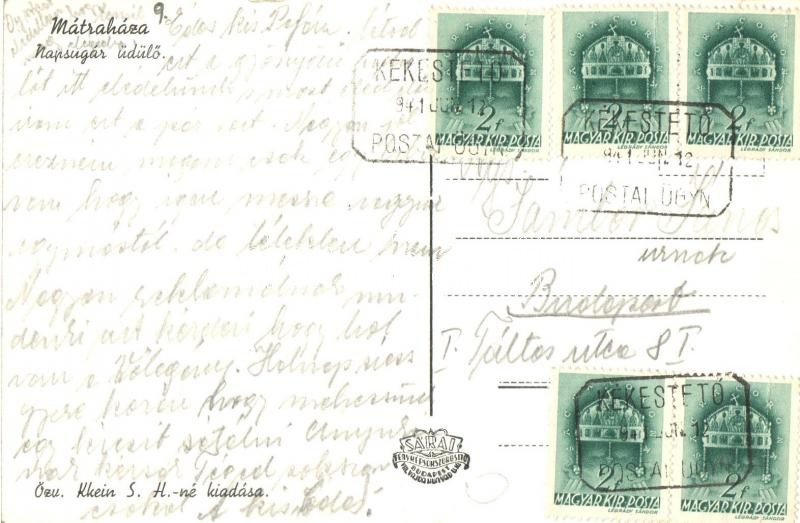 Leírás: Mátraháza (Gyöngyös), Napsugár üdülő (JOINT zsidó világszervezet üdülője), bauhaus. Özv. Klein S. H.-né kiadása + 1941 Kékestető Postai Ügyn. pecsét