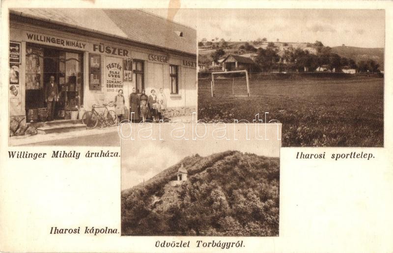 Torbágy, Biatorbágy; Iharosi kápolna, Iharosi sport telep, focipálya, Willinger Mihály üzlete és saját kiadása, kerékpár. Wokaun fényképész felvétele (EK)