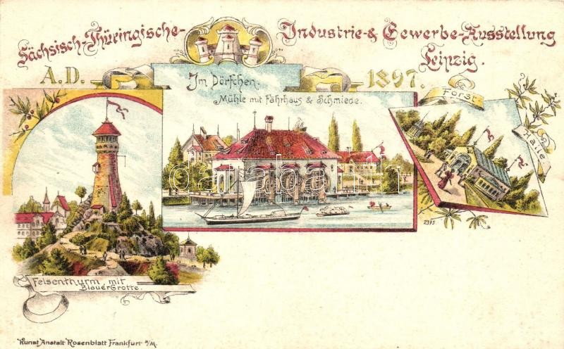 1897 Leipzig, Sächsisch-Thüringische Industrie und Gewerbe Ausstellung, felsenthurm, Blauer Grotta, Im Dörfchen, Mühle mit Fährhaus und Schmiede / Saxon-Thuringian Industry and Trade Exhibition. Kunstanstalt Rosenblatt Art Nouveau, floral, litho (EK)