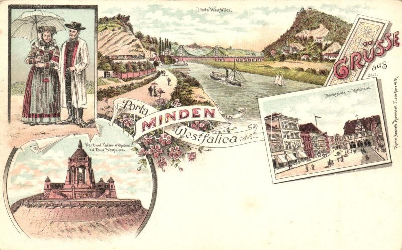 Leírás: Minden im Westfalica, Porta, Marktplatz, Denkmal Kaiser Wilhelms I / market square, monument. Kunstanstalt Rosenblatt Art Nouveau, floral, litho (EK)