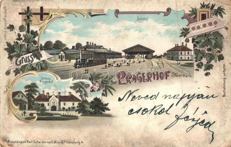 Leírás: Pragersko, Pragerhof; Bahnhof, Schloss / railway station, castle, locomotive. Karl Schwidernoch Art Nouveau, floral, litho (fa)