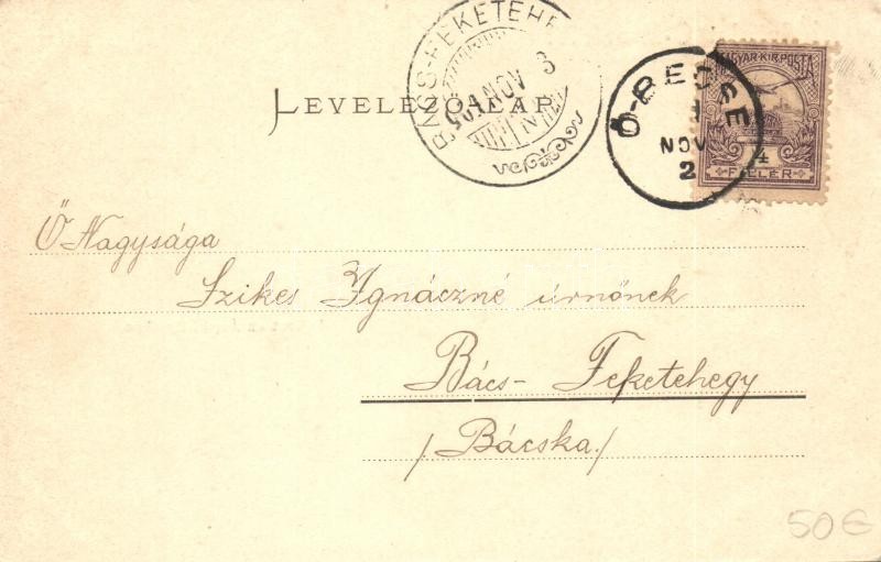 Leírás: 1901 Óbecse, Stari Becej; Árpád-ligeti főbejárat, Fő utca, protestáns templom, Lőkert / park, shooting hall, church, main street. Art Nouveau, floral
