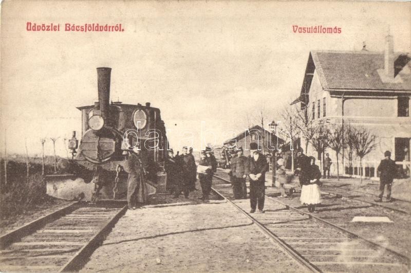 Leírás: Bácsföldvár, Backo Gradiste; Vasútállomás, gőzmozdony, vasutasok / Bahnhof / railway station, locomotive, railwaymen