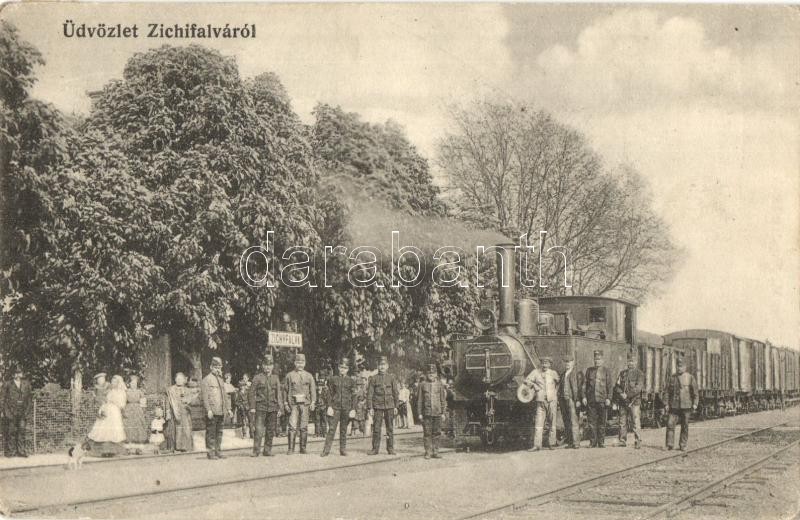 Leírás: Zichyfalva, Zichydorf, Plandiste; Vasútállomás, vasutasok, gőzmozdony. Kühn M. kiadása / Bahnhof / railway station, railwaymen, locomotive (EK)
