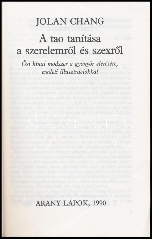 Chang, Jolan: A tao tanítása a szerelemről és szexről. Ősi kínai módszer a gyönyör elérésére, eredeti illusztrációkkal. 1990, Arany Lapok. Kiadói papírkötés, jó állapotban.