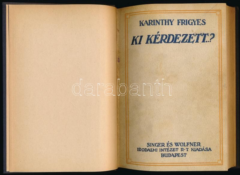 Karinthy Frigyes: Ki kérdezett..? (Címszavak a nagy enciklopédiához.) Bp.,1926,Singer és Wolfner. Első kiadás! Átkötött egészvászon-kötés, az eredeti elülső papírborítót bekötötték, jó állapotban.