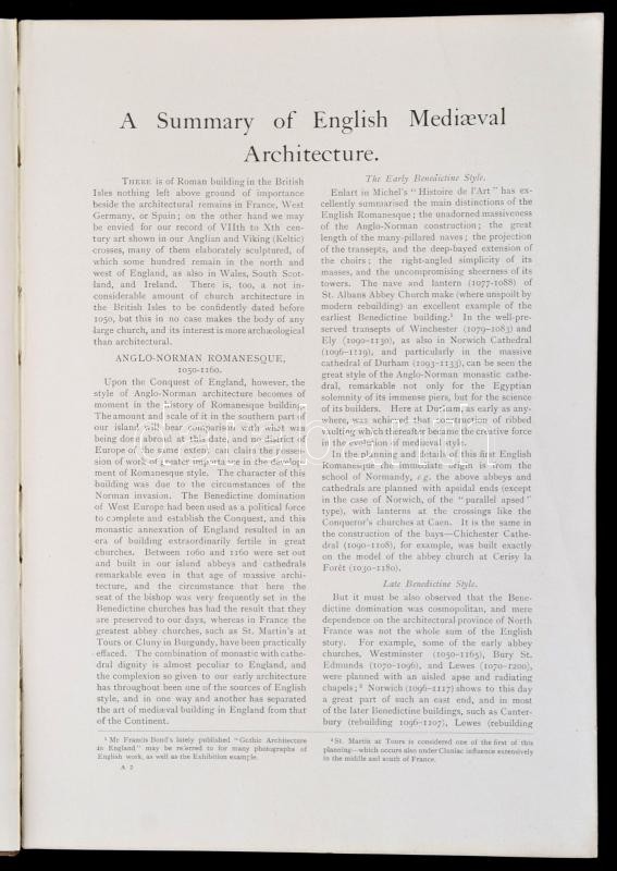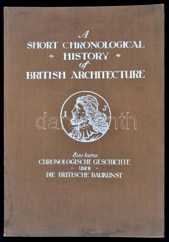 Edward S. Prior-J.A. Gotch-Mervyn E. Macartney: A Short Chronological History of British Architecture. Eine kurze Chronologische Geschichte über Die Britische Baukunst. [London, é.n.(cca 1910), Technical Journal], 159 p. Gazdag fekete-fehér fotóanyaggal illusztrálva. Kiadói egészvászon-kötés, a címlap hiányzik, 113/114 oldal szakadt, a Lehmann&Wentzel Buch und Kunsthandlung cég címkéjével.