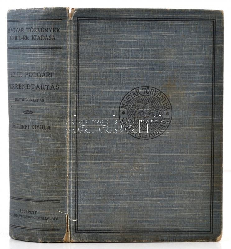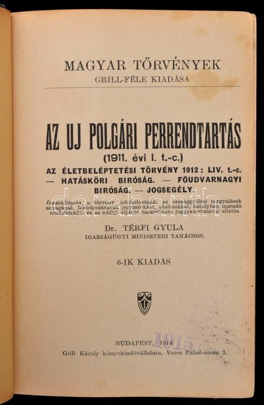 Az uj polgári perrendtartás. (1911. évi I. t.-c.) Az életbeléptetési törvény 1912: IV. t.-c. - Hatáskori bíróság. - Főudvarnagyi bíróság. - Jogsegély. Összeállította: Dr. Térfi Gyula. Bp.,1914, Grill. Hatodik kiadás. Kiadói egészvászon-kötés, kissé kopott, kissé foltos borítóval, kissé sérült gerinccel.