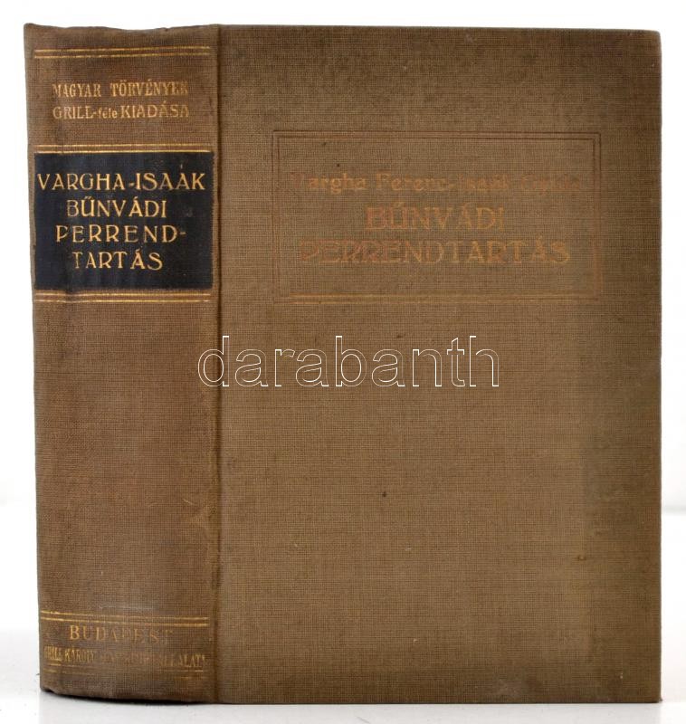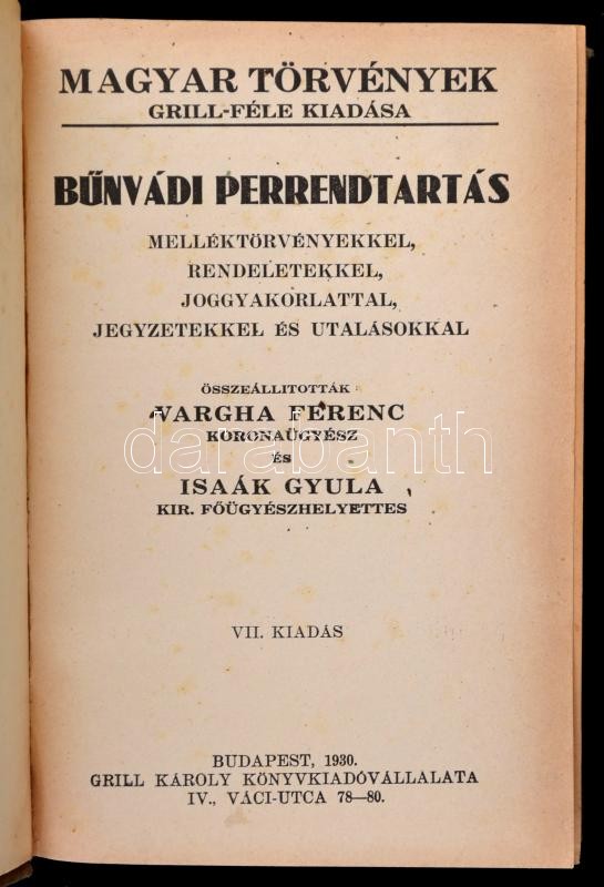 Bűnvádi perrendtartás. Melléktörvényekkel, rendeletekkel, joggyakorlattal, jegyzetekkel és utalásokkal. Összeállították: Vargha Ferenc, Isaák Gyula. Magyar Törvények Grill-féle kiadása. Bp.,1930, Grill Károly. VII. kiadás. Kiadói aranyozott egészvászon-kötés.
