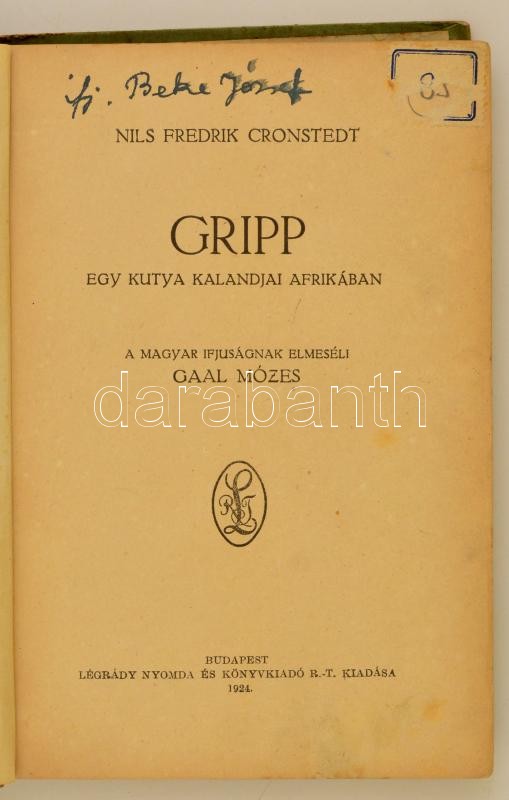 Cronstedt, Nils Fredrik: Gripp. Egy kutya kalandjai Afrikában. Bp., 19... https://www.darabanth.com/hu/326-Gyorsarveres/326.0/Konyvek/Konyvek-Mesekonyvek-ifjusagi-irodalom~1500019/Cronstedt-Nils-Fredrik-Gripp-Egy-kutya-kalandjai-Afrikaban-Bp-1924-Legrady-Kicsit-laza-k~II1816579