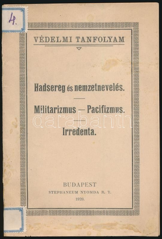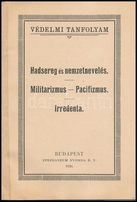 Leírás: Hadsereg és nemzetnevelés. Militarizmus-pacifizmus-irredenta. Bp., 1920. Védelmi tanfolyam. 56p. Borítón folt, belül szép állapotban