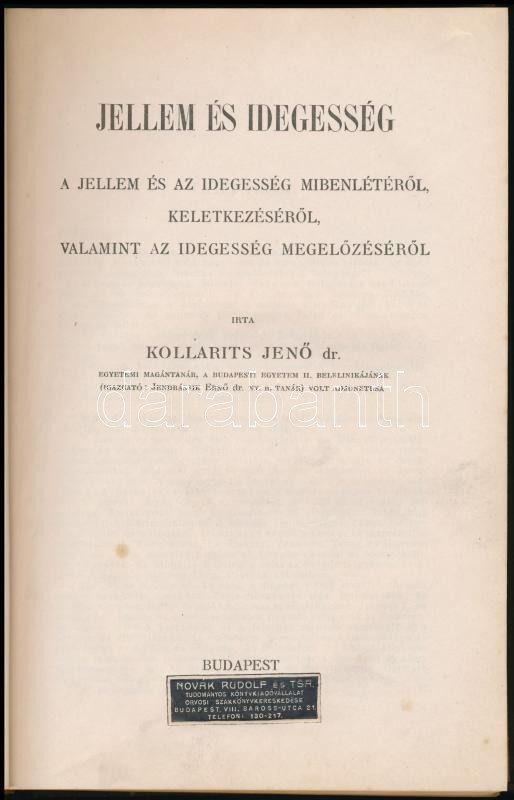 Dr. Kollarits Jenő: Jellem és idegesség. A jellem és az idegesség mibenlétéről, keletkezéséről, valamint az idegesség megelőzéséről. Bp., 1918, Magyar Orvosi Könyvkiadó Társulat. Kiadói egészvászon-kötés, kissé laza fűzéssel.