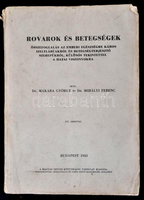 Dr. Makara György-Dr. Mihályi Ferenc: Rovarok és betegségek. Összefoglalás az emberi egészségre káros ízeltlábúakról és betegségterjesztő szerepükről, különös tekintettel a hazai viszonyokra. Bp.,1943, Magyar Orvosi Könyvkiadó Társulat. Kiadói papírkötés, kissé sérült gerinccel, foltos.