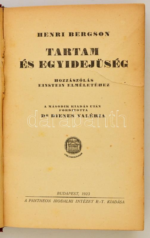 Leírás: Henri Bergson: Tartam és egyidejüség. Hozzászólás Einstein elméletéhez. Bp., 1923, Pantheon Irodalmi Intézet. Kiadói aranyozott egészvászon kötésben.